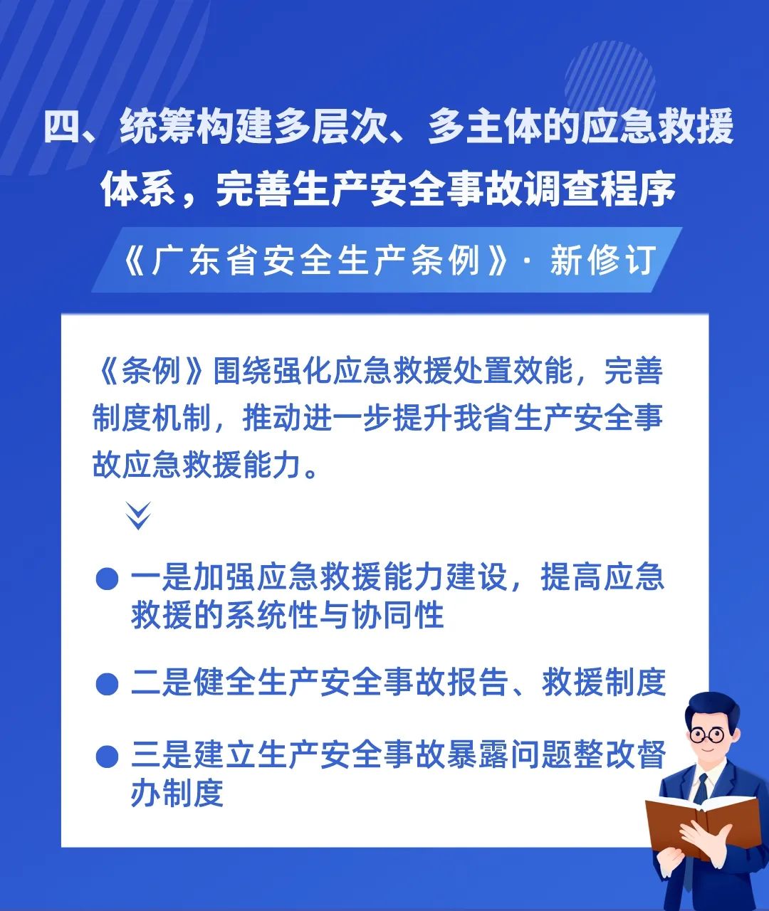 新《广东省安全生产条例》全面落实上位法规定和国家改革部署,吸收固化近年来,安全生产监管实践中的成功经验做法,在健全完善安全生产监督管理体制,分类施策强化重点行业领域,关键性作业环节的安全管理,源头防范化解重大安全风险,统筹构建多层次、多主体的应急救援体系,完善生产安全事故调查程序等方面均有创新亮点。《条例》共六章,共六十八条,主要规定了以下四个方面的内容。