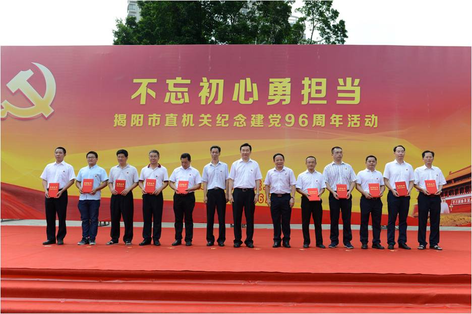 为庆祝中国共产党成立96周年,喜迎党的十九大胜利召开,6月30日上午,揭阳市直工委、市扶贫办在市区青年文化广场举行“不忘初心勇担当”揭阳市直机关庆祝建党96周年活动,命名一批“不忘初心勇担当”扶贫党员标兵等称号,同时举行老党员重温入党誓词暨新党员入党宣誓仪式,市直机关100多个单位的党组织负责人、组织委员,受命名的单位代表和个人,新、老党员代表近1000人参加。活动由市直工委书记黄少鹏同志宣读《关于命名市直机关“不忘初心勇担当”扶贫党员标兵的决定》,市委副书记、市政法委书记刘光明同志,市直工委书记黄少鹏同志、市扶贫办主任郑宏光同志为“不忘初心勇担当”扶贫党员标兵颁奖。