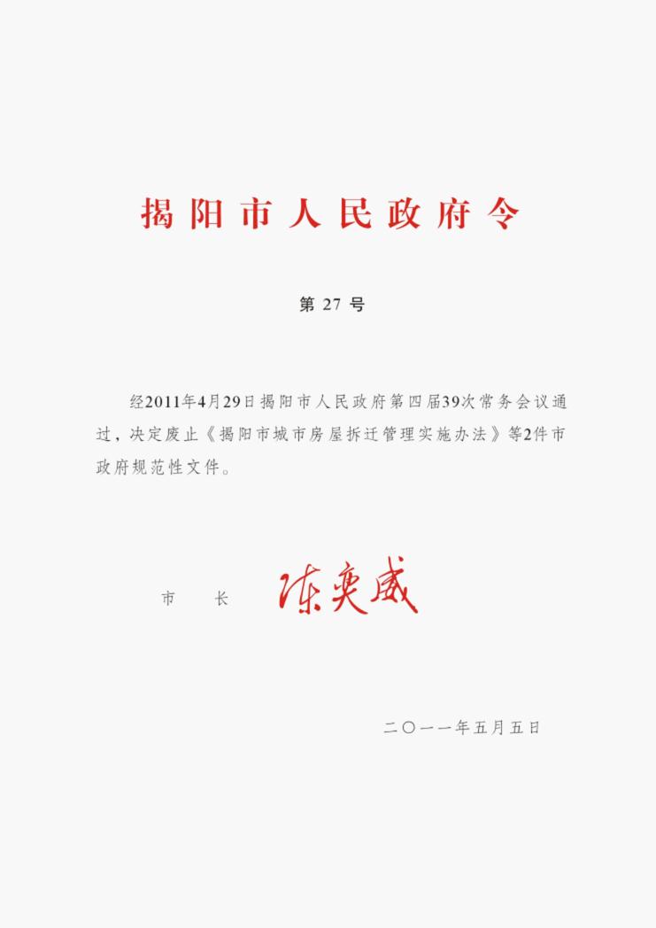| 文号: | 揭府令第27号 | 发布日期: | 2011-05-12 |