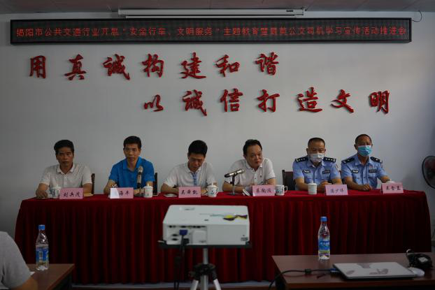 市交通运输局吴舜凯副局长作了动员讲话。吴舜凯副局长肯定了揭阳公交、出租车行业各企业及其全体管理人员、从业人员为我市公共交通发展所作出的贡献,特别是在疫情防控工作中,发扬“逆行者”作风,全力做好疫情联防联控工作,齐心协力堵住疫情通过公共交通工具传播,为打赢这次疫情防控工作阻击战贡献了公共交通人的力量。他强调,行业安全生产一直是行业管理部门和各企业及其从业人员一个永恒的主题,各企业相关负责人要当好企业的安全守护人,也要认真当好驾驶员的安全教导员,高度重视安全生产工作,认真落实安全生产责任,坚持不懈的落实好企业的各项安全生产措施。各位驾驶员作为道路交通的直接参与者,更应该把维护道路交通安全作为自己的首要职责,自觉加强对交通法律法规的学习,提高自身法律意识和安全意识,遵章守纪,谨慎驾驶,为营造一个安全、有序、畅通的道路交通安全环境做出自己应有的贡献。吴舜凯副局长指出,当前公交、出租车行业还存在一些不文明行为,希望全体企业及其从业人员要加强管理,规范经营,诚信经营,文明服务,大力提高服务水平;全体驾驶员既要当好文明城市的宣传员、导游员和服务员,又要给乘客献爱心、留真情提供最佳服务,真正做到语言文明、行车文明、车容文明、服务文明,以干净整洁的车容车貌、文明规范的服务,充分发挥公共交通行业这个城市“名片”辐射作用,真正把公交、出租车行业打造成为城市文明的窗口,真正成为城市文明的弘扬者、践行者。