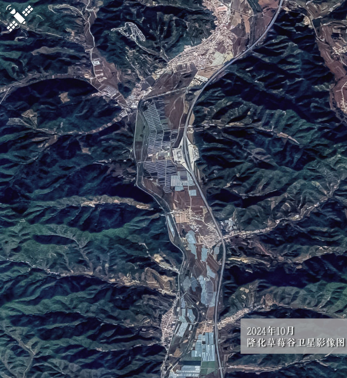 2024年10月的隆化草莓谷卫星影像图中可见连片草莓大棚群。其中,位于七家镇西道村的隆化草莓谷,配备物流中心、草莓主题体验区等设施,打造以草莓为核心的主题农旅融合示范区,有效带动农民增收。