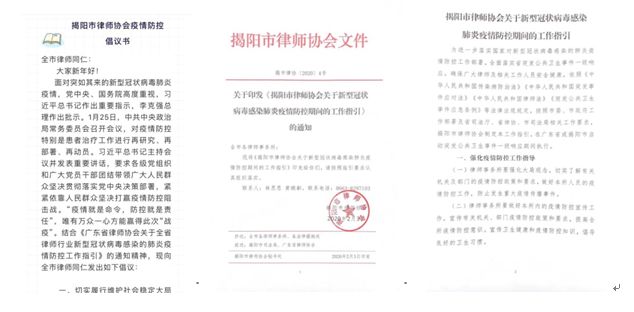 为进一步落实国家对新型冠状病毒感染的肺炎疫情防控工作部署,全面落实省突发公共卫生事件一级响应,确保广大律师及相关工作人员安全健康。按照市委、市政府工作部署及省司法厅、省律协、市司法局相关工作要求,揭阳市律师协会于1月29日向全市律师发布《揭阳市律师协会疫情防控倡议书》,并于2月3日制定《关于新型冠状病毒感染肺炎疫情防控期间的工作指引》,要求全市律师行业通力合作,共同做好疫情防控工作指导、工作场所疫情防控、从业主体疫情防控等工作,严格控制举办集体聚集活动,建立疫情防控工作保障机制。