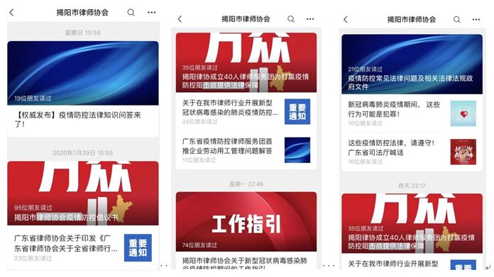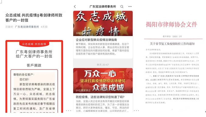 二是主动做好揭阳市律师行业的疫情防控和业务指导工作。通过官方网站、公众号和微信群等方式,积极对疫情防控工作进行宣传、引导,转发权威渠道发布的疫情通报和工作指引;根据省政府的通知要求建议各律师事务所适当延迟复工;倡导各律所将法律服务从线下引入线上,通过电话、微信、短信、电子邮件等方式,为群众及企业解读疫情发生时对民事行为的影响、疫情防控中企业用于法律应对等相关法律问题,以实际行动积极支持抗击疫情工作。
