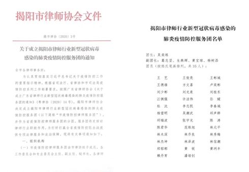 为贯彻落实习近平总书记关于疫情防控的重要指示精神,根据省司法厅、省律协和市司法局疫情防控系列工作部署要求,按照省律协《关于成立广东省律师行业新型冠状病毒感染的肺炎疫情防控律师服务团的通知》,2月4日,市律协组织市律协班子成员、各工作委员会和专业委员会主任、副主任、秘书长以及各律所主任组成40人的“揭阳市律师行业新型冠状病毒感染的肺炎疫情防控服务团”,切实发挥好律师行业职能作用,为打好打赢疫情防控阻击战提供专业法律服务和法治保障。