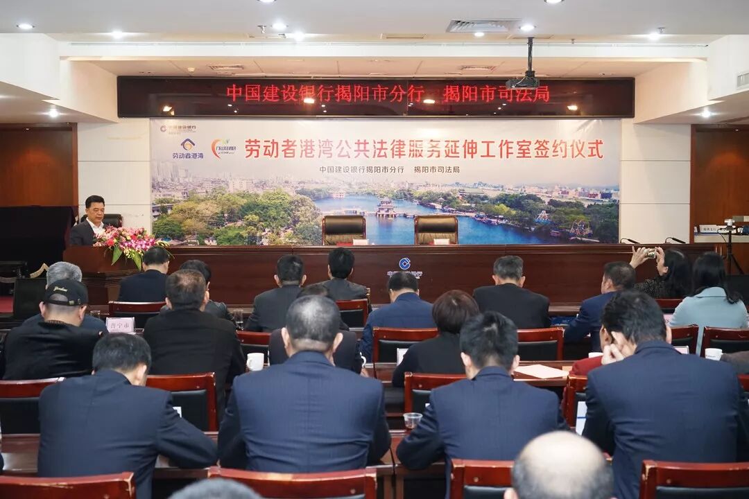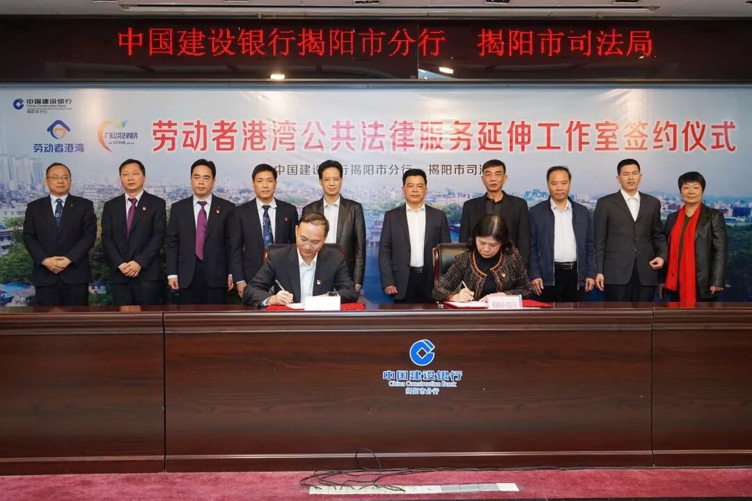 为深入贯彻习近平总书记关于深化公共法律服务体系建设的重要指示精神,按照省司法厅、建设银行广东省分行的工作部署,1月2日上午,揭阳市司法局与中国建设银行揭阳市分行举行“劳动者港湾公共法律服务延伸工作室”共建活动签约、揭牌仪式,双方将通过互助协作的政银合作模式,提供更惠民、更便民的公共法律服务,为推动我市法治建设新进程、构建社会治理共建共治共享格局上做出新贡献。