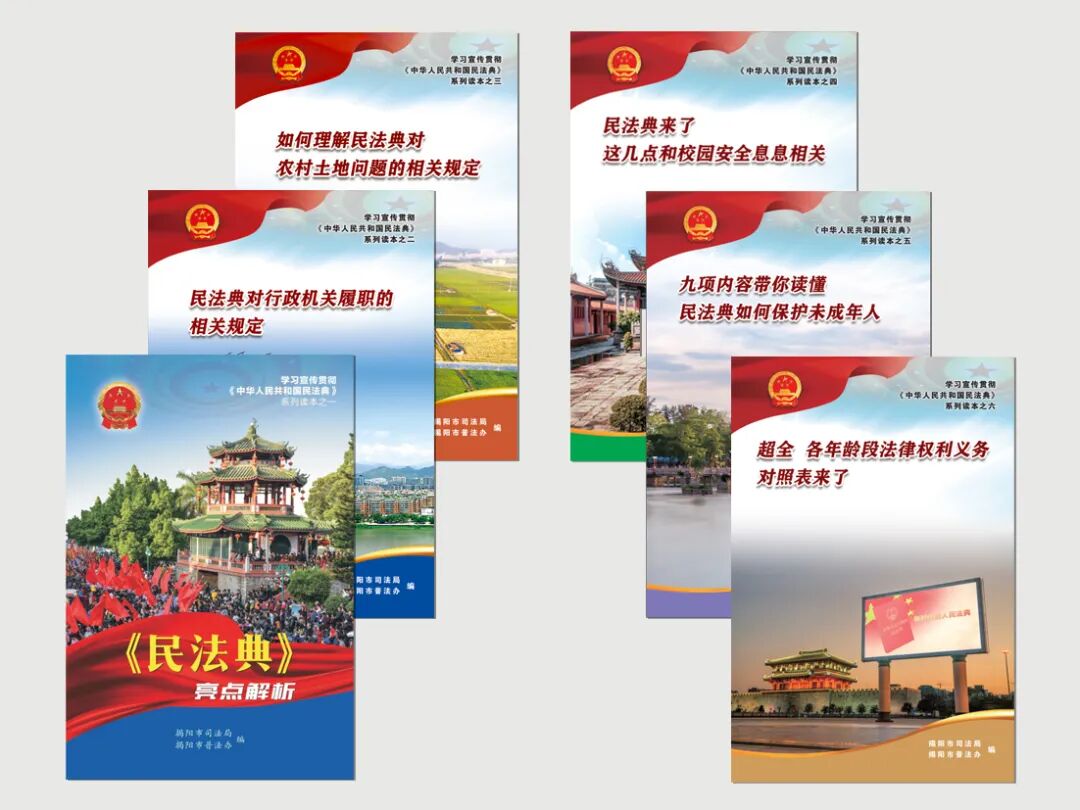 市司法局、市普法办编辑学习宣传贯彻《中华人民共和国民法典》系列读本一套六册,分别对总则七编各个亮点和热点问匙进行解读,共印制60000多册发放全市各县(市区)和市直单位开展落地宣传使用。