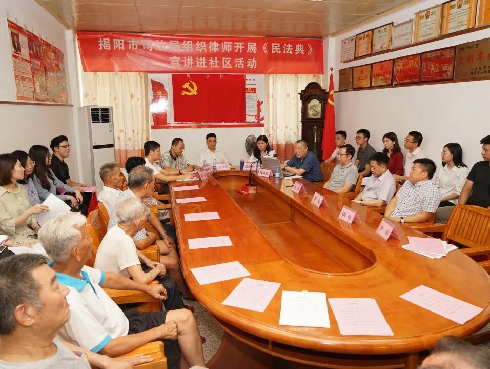发挥各级法学会、普法讲师团、律师专业法律人士和社工团体在民法典普法中的骨干作用,市普法办、市司法局、市律协联合成立“揭阳市民法典律师普法宣讲团”,组织开展2020年“全市普法讲师团民法典普法公益行”活动,举行民法典普法宣传进机关、进单位、进乡村(社区)、进军营、进校园、进企业活动。目前全市均已铺开宣讲活动。其中村居顾问律师线下进村(社区)宣讲104场次,线上利用直播平台宣讲13场次。