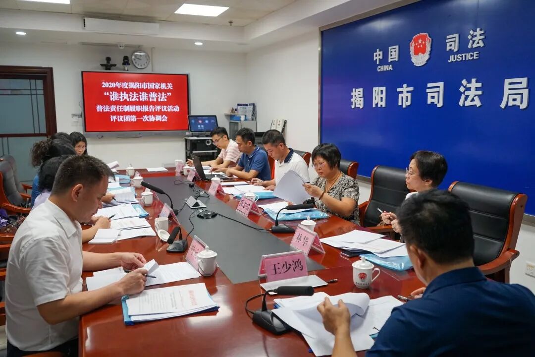 为确保2020年度揭阳市国家机关“谁执法谁普法”普法责任制履职报告评议活动顺利开展,9月4日上午,市普法办、市司法局组织召开履职报告评议活动评议团第一次协调会。市司法局局长、市普法办主任王少鸿出席会议并讲话。市司法局副局长、市普法办副主任叶元春主持会议。