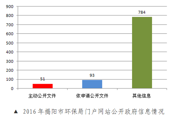 2016年,揭阳市环境保护局认真贯彻落实《条例》和《办法》,在市人民政府的正确领导下,不断建立和完善政府信息公开制度,认真办理政府信息公开申请,扎实推进政府信息公开工作。全年通过门户网站发布各类环保信息共928条,其中:主动公开文件51个,依申请公开文件93个,其它信息784条。