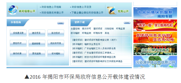 (一)加强载体建设,丰富公开渠道。我局在局网站设置栏目公开行政许可事项、办事指南、办事受理信息和结果公告等,提供资料下载服务、办事导航、高级检索、腾讯微博、新浪博客,QQ实时咨询等服务栏目,还设置了“两学一做”专栏、民主评议政风行风专栏、中央环保督察专栏等信息公开栏目。另外,2016年,我局官方微信公众号“环保揭阳”多次进入南方周末发布的“中国政务绿色公号周榜TOP20”市县级排行榜。