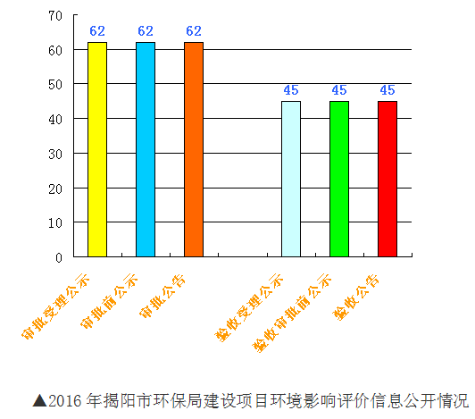 三是推进建设项目环境影响评价信息公开。我局做到环评受理、审批和验收全过程公开。全年建设项目环境影响评价文件审批受理公示62项次,审批前公示62项次、审批公告62项次,验收受理公示 45项次,验收审批前公示45项次,验收公告45项次。