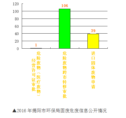 四是做好固废危废信息公开。公开了2016年揭阳市危险废物污染防治信息公告;危险废物(医疗废物)经营许可证审批信息1条;危险废物跨市转移审批信息106条,进口固体废物申请39条。