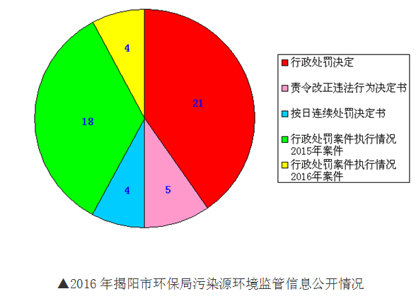 五是及时公开污染源环境监管信息。包括重点污染源基本情况、污染源监测、总量控制、污染防治、排污费征收、环境监察执法、环境应急等。公开行政处罚决定21个,责令改正违法行为决定书5个,按日连续处罚决定书4个,行政处罚案件执行情况2015年案件18件、2016年案件4件。