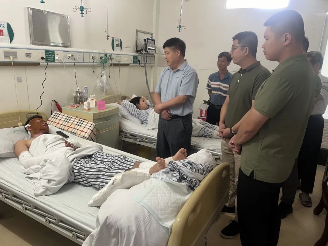 突如其来的灾难给谢明标家庭带来沉重打击,面对一家人如此严重的伤势和高昂的医疗费用,谢明标一家陷入了深深的绝望之中。在获悉谢明标的遭遇后,揭阳市退役军人事务局党组高度关注并多方发动爱心力量给予援助。揭阳市爱国拥军促进会迅速响应,立即发动筹集慰问资金5万元。9月27日,在市退役军人事务局吴宗鑫副局长带领下,我会轮值会长刘春海及多位理事会成员一同前往所在医院看望慰问谢明标及家人,鼓励他们坚定信心,积极配合治疗,并送上了关心和祝福。同时,我会积极联系发动社会各界爱心人士和慈善机构,继续为谢明标家庭筹集治疗费用。