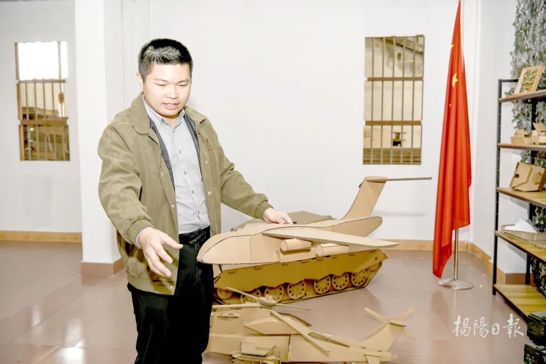 在市爱国拥军促进会副会长兼秘书长郑诗凯的工作室里,一件件由纸板拼装而成的坦克、飞机、航空母舰及各种枪支的模型摆满一地,这是郑诗凯在创业中带领团队开发打造军事主题纸模的创新尝试,也是他退役后延续军人精神、守护军旅初心的方式。