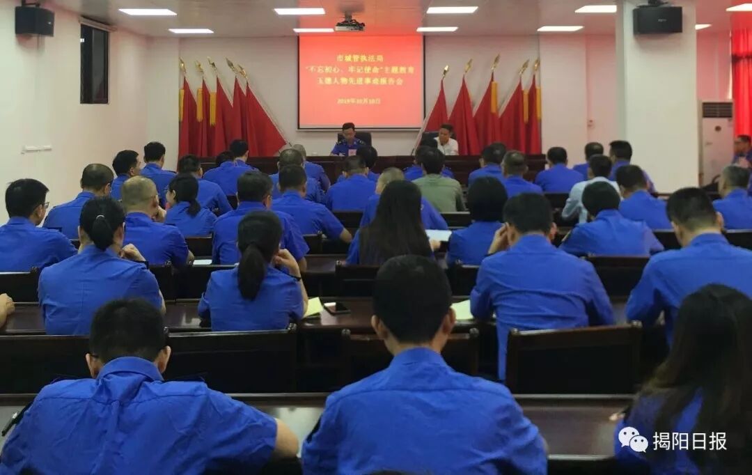 ▲ 市城管执法局“不忘初心、牢记使命”主题教育玉德人物先进事迹报告会。城市管理体制更加理顺、综合执法效率明显提高、“小城大管”格局基本形成、执法队伍行为更加规范……目前,我市城管执法体制改革工作已取得明显成效,城市管理水平也随之水涨船高,带来的最直观的体现就是市容市貌越来越靓了。如今的揭阳,街区干净整洁、“门前三包”逐步覆盖、社会主义核心价值观及“讲文明、树新风”公益广告随处可见,市容“颜值”不断刷新……这是每一位市民亲眼见证并切身感受到市容市貌带来的喜人变化。在这喜人变化的背后,是市城管执法部门对城区主干道、商业街、背街小巷等重点区域,服务窗口、办事大厅、公共场所等处周边市容环境薄弱环节切实加强规范化建设管理;常态化整治出店经营、占道违章停车等现象,确保主次干道无摆摊设点,菜市场周边无出摊经营、流动摆卖现象;以落实“门前三包”责任制为抓手,设立“门前三包”责任制公示牌,全面清理整治街道、公共场所乱贴画、乱堆乱放等不文明现象;对市区主次干道路边乱搭建及不适宜的围挡开展清拆,通过实地巡查,拍照确定需整治的典型点位,将问题台账下发问题所在区,落实清拆任务……市城管执法局负责人表示,下一步,将提升治理能力,创新工作方法,细化工作标准,妥善应对和处理城市管理综合执法过程中出现的新矛盾和新问题,落实“721”工作法,即争取让70%的问题用服务手段解决,20%的问题用管理手段解决,10%的问题用执法手段解决,致力让我们共同居住的城市越来越靓丽、越来越美好。