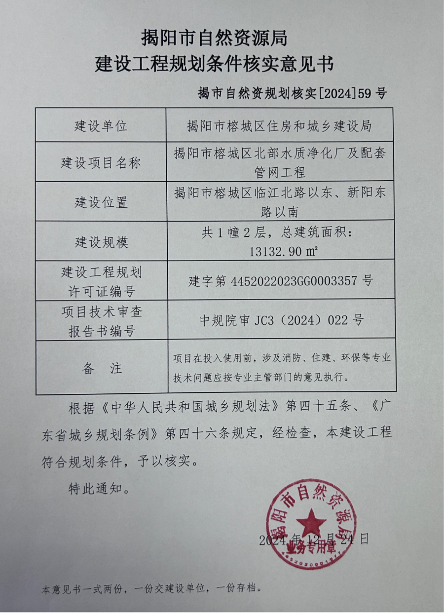 “揭阳市榕城区北部水质净化厂及配套管网工程”建设工程规划条件核实意见书