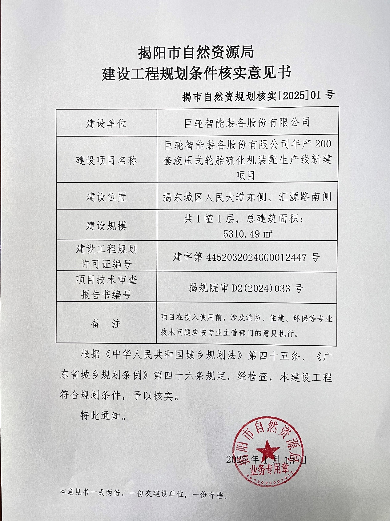 “巨轮智能装备股份有限公司年产200套液压式轮胎硫化机装配生产线新建项目”建设工程规划条件核实意见书