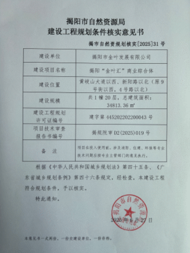 “揭阳‘金叶汇’商业综合体”建设工程规划条件核实意见书