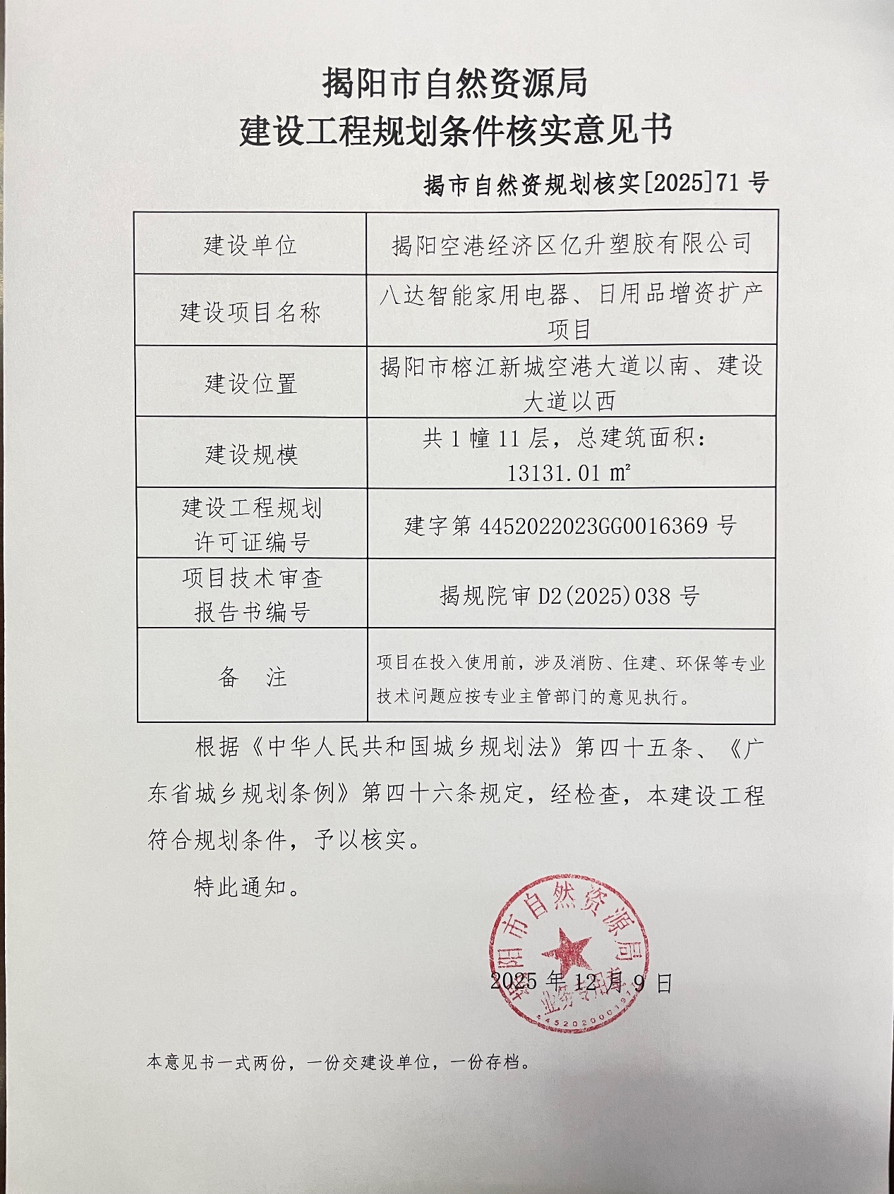 “八达智能家用电器、日用品增资扩产项目”建设工程规划条件核实意见书