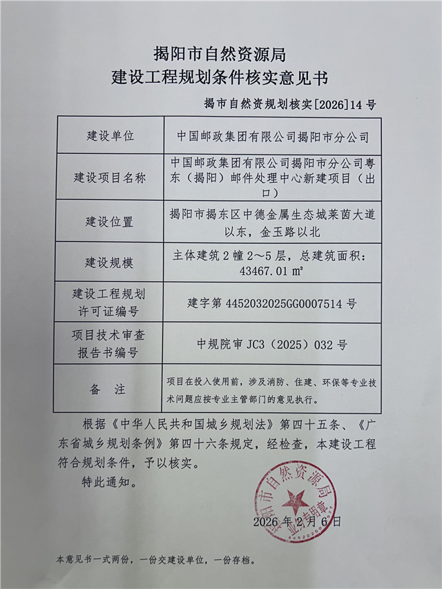 “中国邮政集团有限公司揭阳市分公司粤东(揭阳)邮件处理中心新建项目(出口)”建设工程规划条件核实意见书