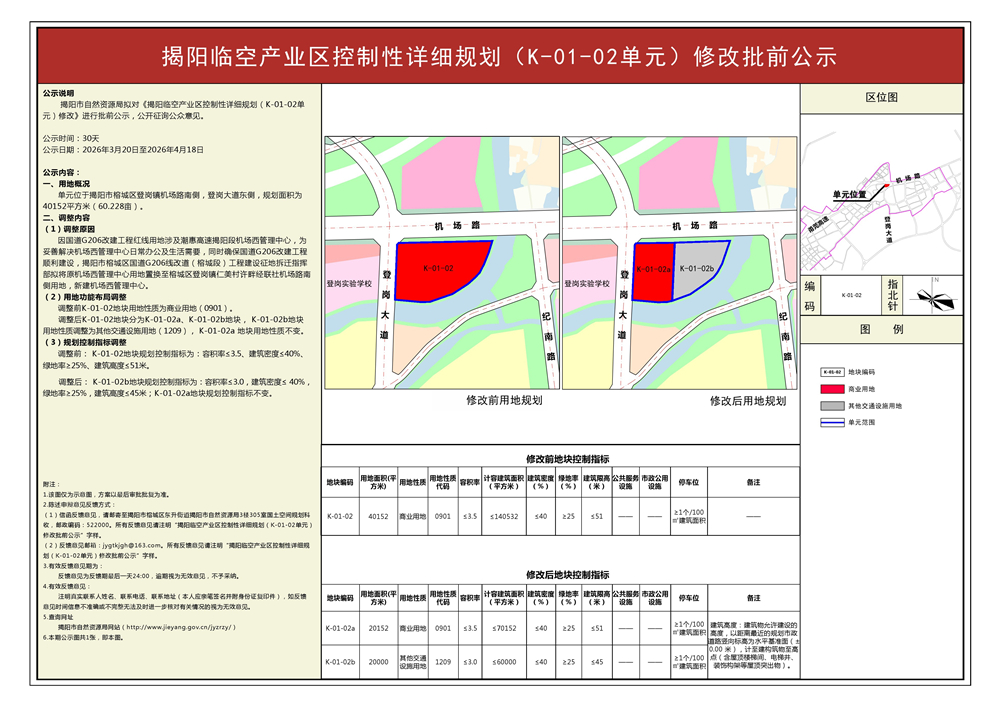 揭阳临空产业区控制性详细规划(K-01-02单元)修改批前公示