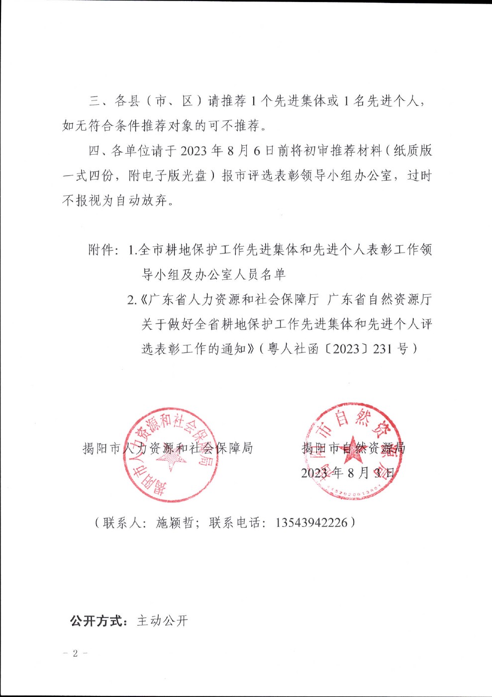 转发广东省人力资源和社会保障厅 广东省自然资源厅关于做好全省耕地保护工作先进集体和先进个人评选表彰工作的通知(揭市人社函〔2023〕328号)