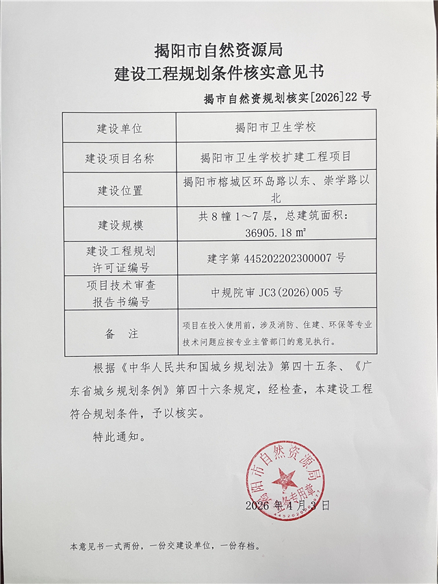 “揭阳市卫生学校扩建工程项目”建设工程规划条件核实意见书