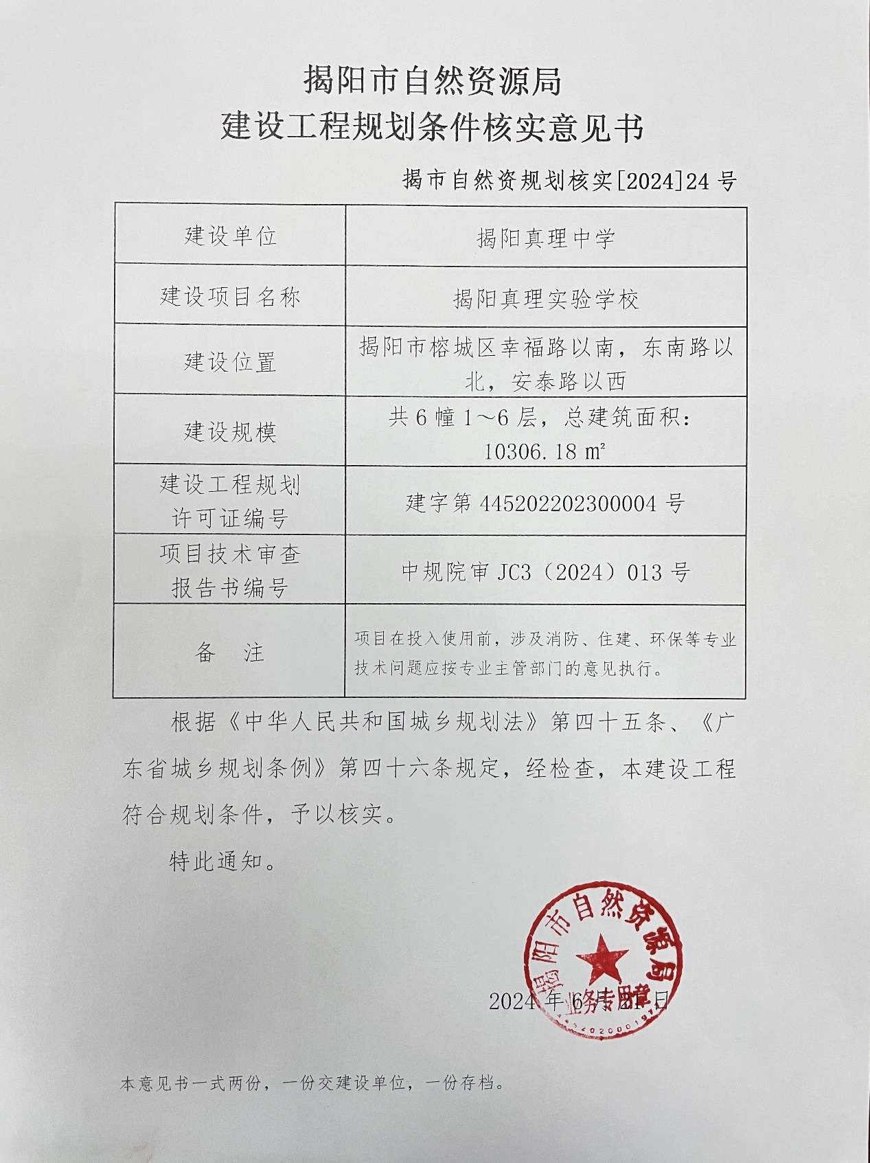 “揭阳真理实验学校”建设工程规划条件核实意见书