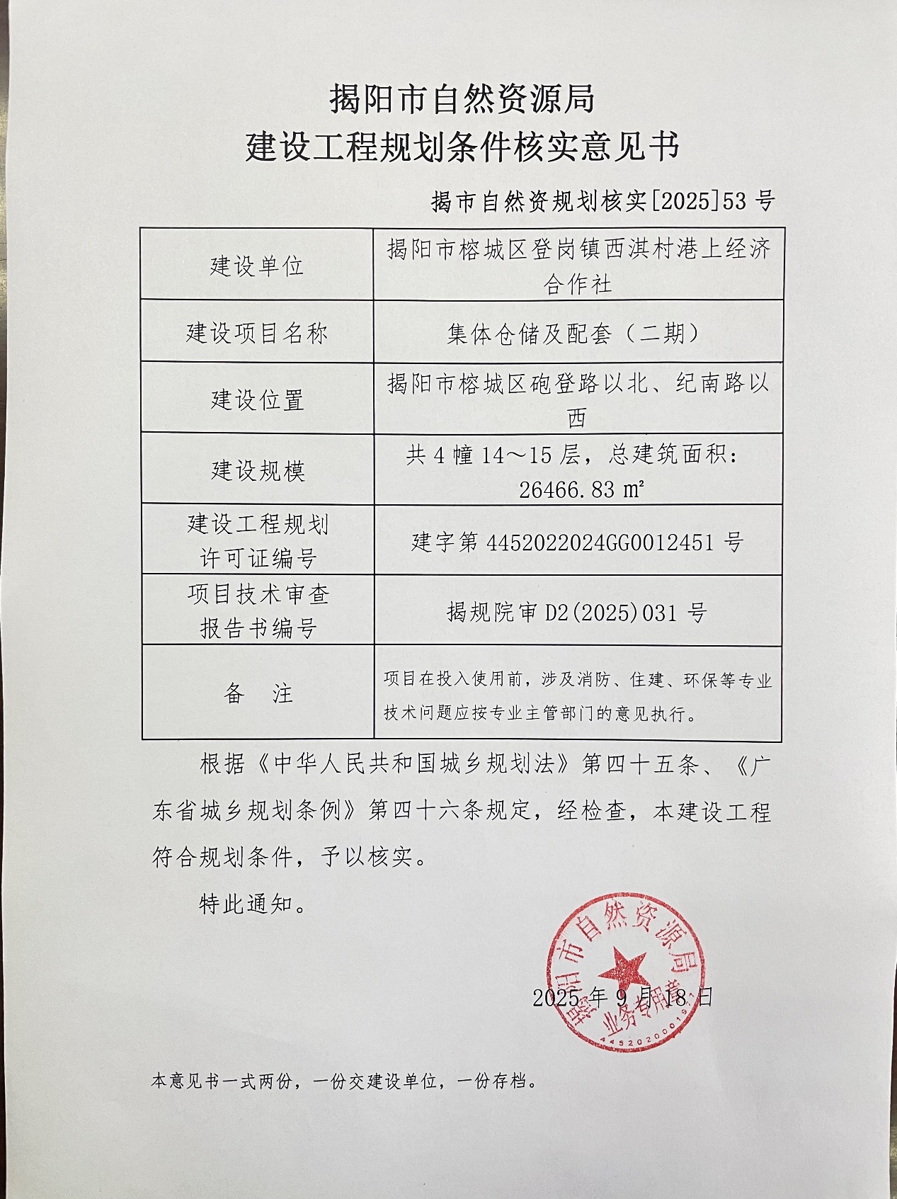揭阳市榕城区登岗镇西淇村港上经济合作社“集体仓储及配套(二期)”建设工程规划条件核实意见书