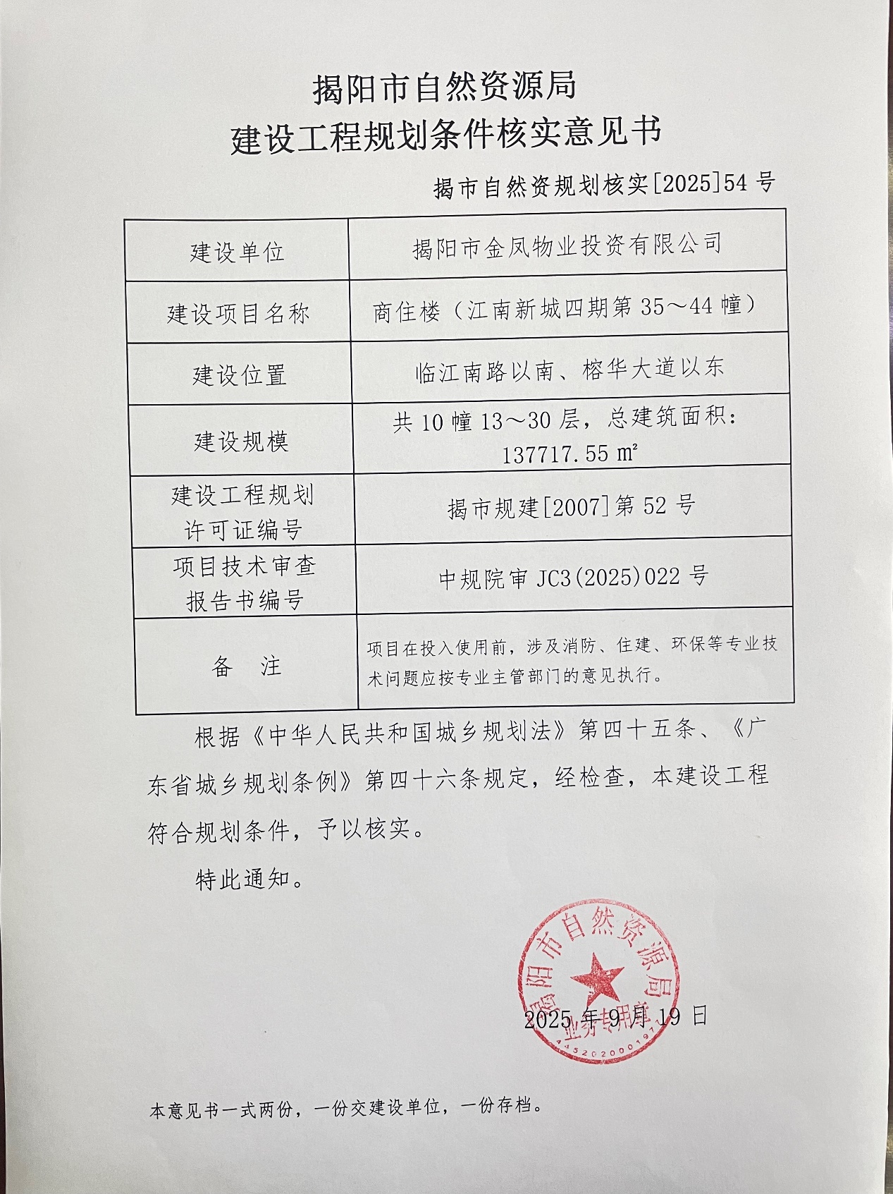 “商住楼(江南新城四期第35~44幢)”建设工程规划条件核实意见书
