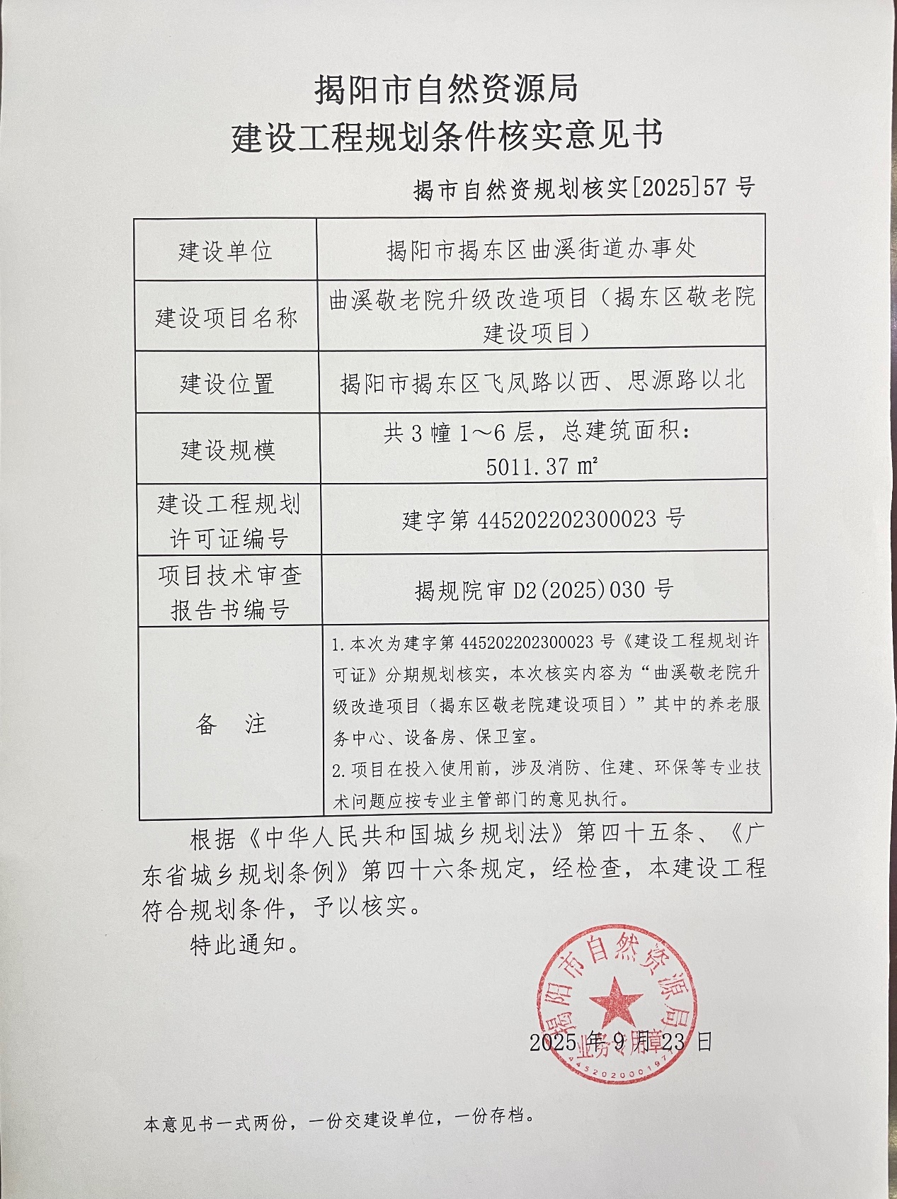 “曲溪敬老院升级改造项目(揭东区敬老院建设项目)”建设工程规划条件核实意见书