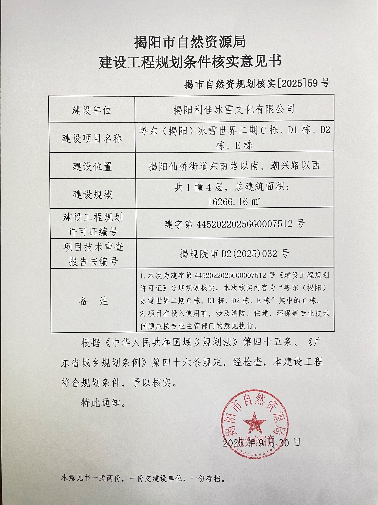 “粤东(揭阳)冰雪世界二期C栋、D1栋、D2栋、E栋”建设工程规划条件核实意见书