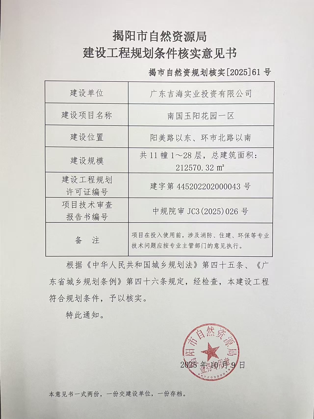 “南国玉阳花园一区”建设工程规划条件核实意见书