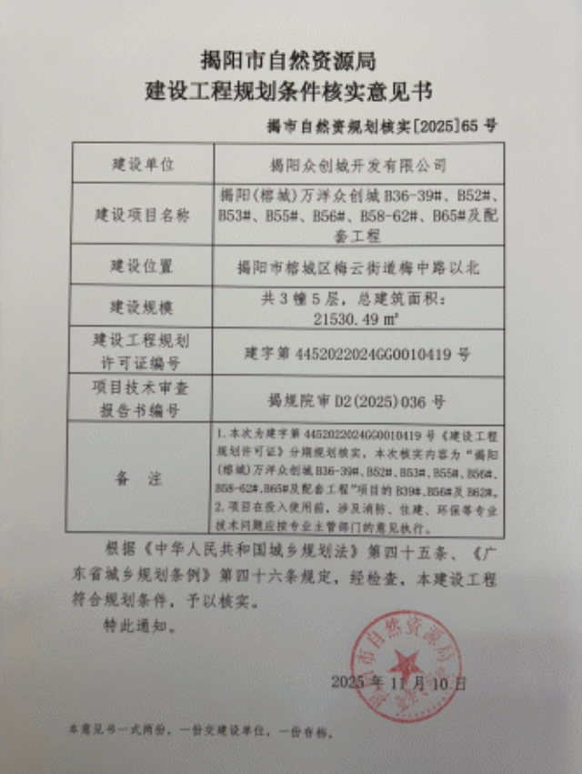 “揭阳(榕城)万洋众创城B36-39#、B52#、B53#、B55#、B56#、B58-62#、B65#及配套工程”建设工程规划条件核实意见书