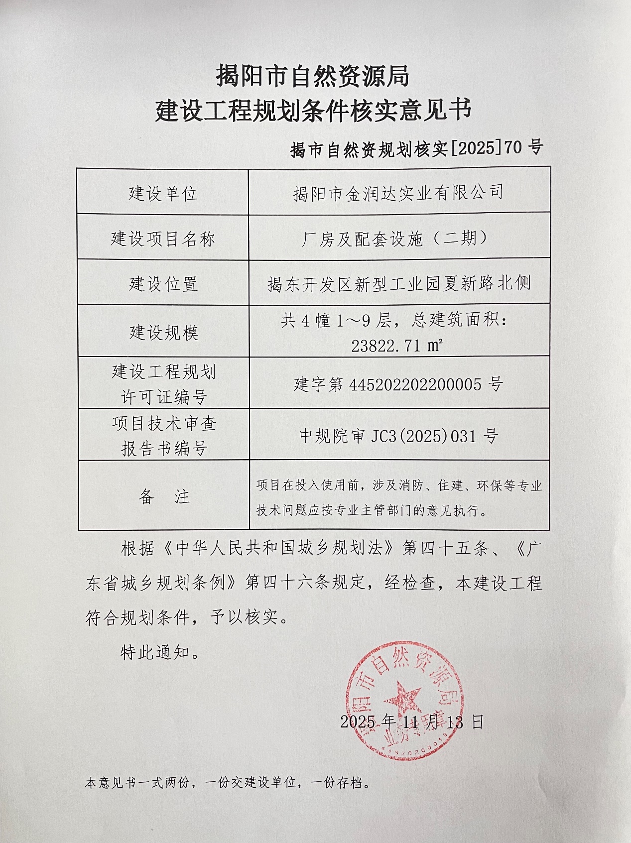 揭阳市金润达实业有限公司“厂房及配套设施(二期)”建设工程规划条件核实意见书
