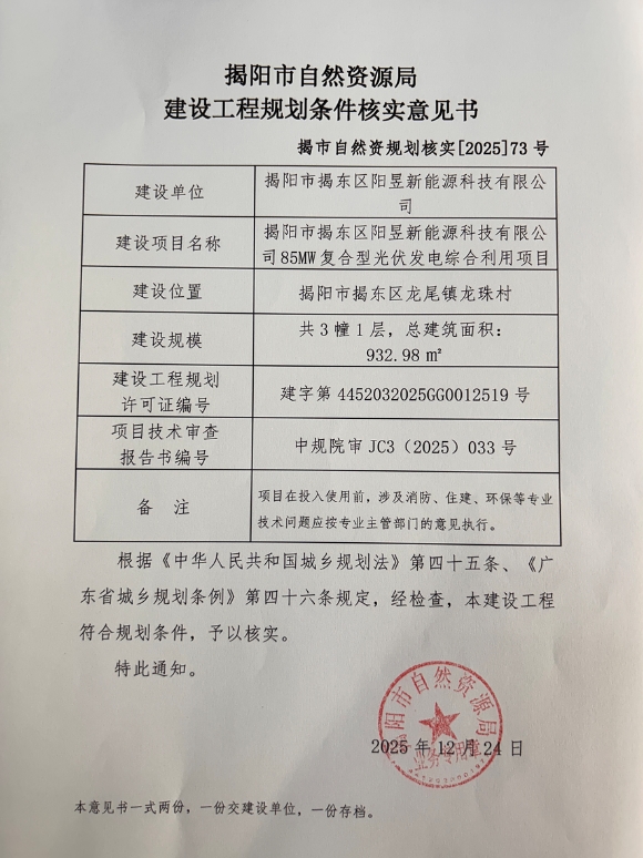 “揭阳市揭东区阳昱新能源科技有限公司 85MW 复合型光伏发电综合利用项目”建设工程规划条件核实意见书