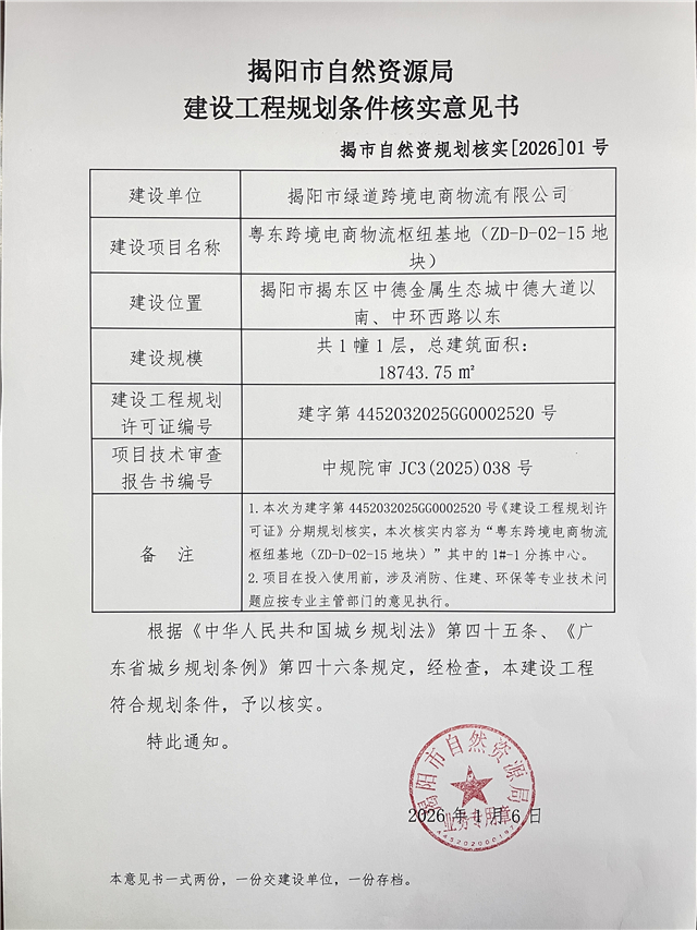 “粤东跨境电商物流枢纽基地(ZD-D-02-15 地块)”建设工程规划条件核实意见书