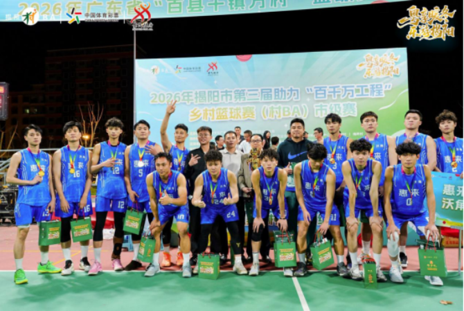 3月19日晚,由揭阳市农业农村局、市文化广电旅游体育局联合主办的2026年揭阳市第三届助力“百千万工程”乡村篮球赛(村BA)在榕城区凤美街道塘埔村体育广场完美收官。惠来神泉沃角村队成功卫冕,拿下“村BA”市级赛三连冠。本次赛事以篮球为媒,聚力统筹乡村资源、擦亮农业品牌、讲好乡村故事,将“村BA”作为展示揭阳乡村振兴成果的重要窗口,赛事组织充分展现乡村特色,体现乡土韵味。