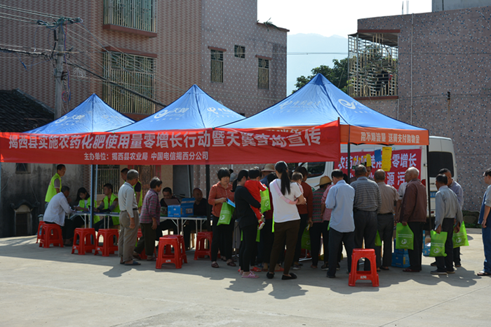为有效控制农药化肥使用量,保障农业生产安全、农产品质量安全和生态环境安全,按照上级的有关部署,10月19日上午,揭西县农业局联合中国电信揭西分公司在五云镇下崆村委开展“揭西县农药化肥使用量零增长暨天翼查询”宣传活动。