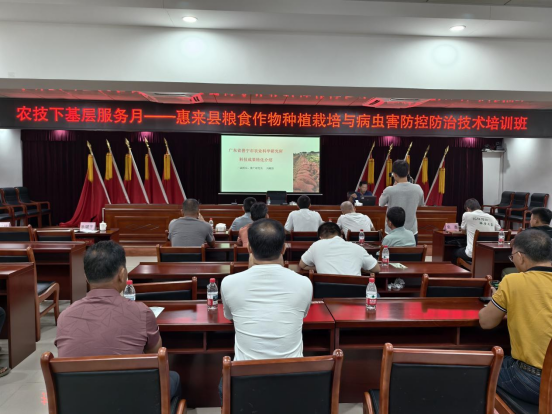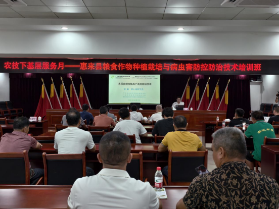 为促进农业科技成果“入县达镇”、直通一线,力争全域提升,揭阳市农业农村局、省农科院揭阳分院联合举办农技下基层服务月活动。系列活动第三站——惠来县粮食作物种植栽培与病虫害防控防治技术培训班于10月11日在惠来县举行,有关农业企业、合作社和种植大户代表40余人参加培训会。