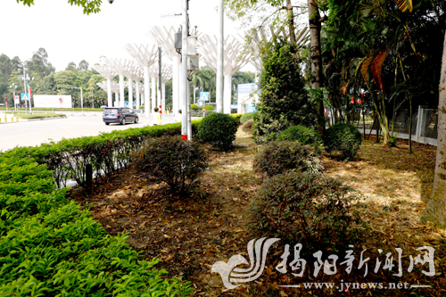揭阳职业技术学院校园内部分绿化带中存在树叶堆积、杂草丛生情况。林碧鸿 摄
