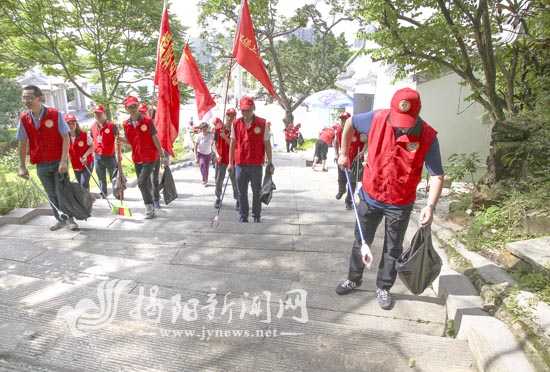 在景区,志愿者捡拾垃圾,为保护环境出力。