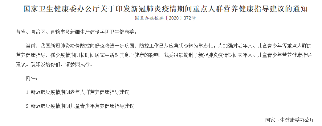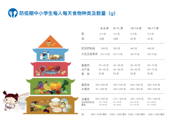 儿童青少年营养健康建议 保证食物多样 疫情期间应保证食物品种多样,建议平均每天摄入食物12种以上,每周25种以上。做到餐餐有米饭、馒头、面条等主食,经常搭配全谷物、杂粮杂豆和薯类。 保证鱼、禽、瘦肉和蛋摄入充足且不过量。优选水产品和禽肉,其次是瘦畜肉。餐餐要有蔬菜,保证每天摄入300-500克蔬菜,其中深色蔬菜应占一半。 (点击可查看大图) 每天吃半斤左右的新鲜水果,喝300克牛奶或吃相当量的奶制品。经常吃大豆及豆制品和菌藻类食物。 合理安排三餐 要保证三餐规律,定时定量,不节食,不暴饮暴食。 要每天吃早餐,早餐应包括谷薯类、肉蛋类、奶豆类、果蔬类中的三类及以上。午餐要吃饱吃好,晚餐要清淡一些。 早餐、午餐、晚餐提供能量应占全天总能量比例 (点击可看大图) 选择健康零食 可以选择健康零食作为正餐的补充,如奶和奶制品、水果、坚果和能生吃的新鲜蔬菜,少吃辣条、甜点、含糖饮料、薯片、油炸食品等高盐、高糖、高油的零食。 (点击可查看大图) 吃零食的次数要少,食用量要小,不能在正餐之前吃零食,不要边看电视边吃零食。儿童零食怎么选?戳→国内首个儿童零食标准公布,这些“六一”礼物未必适合孩子! 每天足量饮水 应每天足量饮水,首选白开水。建议7-10岁儿童每天饮用1000毫升,11-13岁儿童每天饮用1100-1300毫升,14-17岁青少年每天饮用1200-1400毫升。 饮水应少量多次,不要等到口渴再喝,更不能用饮料代替水。 积极身体活动 居家期间应利用有限条件,积极开展身体活动,如进行家务劳动、广播操、拉伸运动、仰卧起坐、俯卧撑、高抬腿等项目,保证每天中高强度活动时间达到60分钟。 如允许在室外活动,可进行快步走、慢跑、球类运动、跳绳等中高强度的身体活动。 避免长时间久坐,每坐1小时站起来动一动,减少上网课以外的看电视、使用电脑、手机或平板的屏幕时间。保证每天睡眠充足,达到8-10小时。 保持健康体重 儿童青少年应关注自己的体重,定期测量自己的身高、体重,学会计算体质指数(BMI,BMI=体重(单位为kg)/身高的平方(单位为m2))自评体重情况。