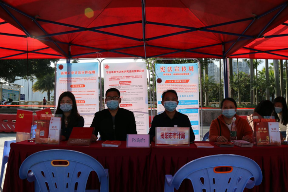 为深入学习宣传贯彻党的二十大精神,贯彻落实习近平法治思想,大力加强宪法学习宣传,弘扬宪法精神,维护宪法权威,推进法治揭阳建设,12月10日上午,市普法办和市司法局联合在青年文化广场举办“12·4”宪法宣传日、宪法宣传周法治宣传系列活动,市审计局总审计师陈伟辉同志带领各科室业务骨干积极参与到此次活动中。