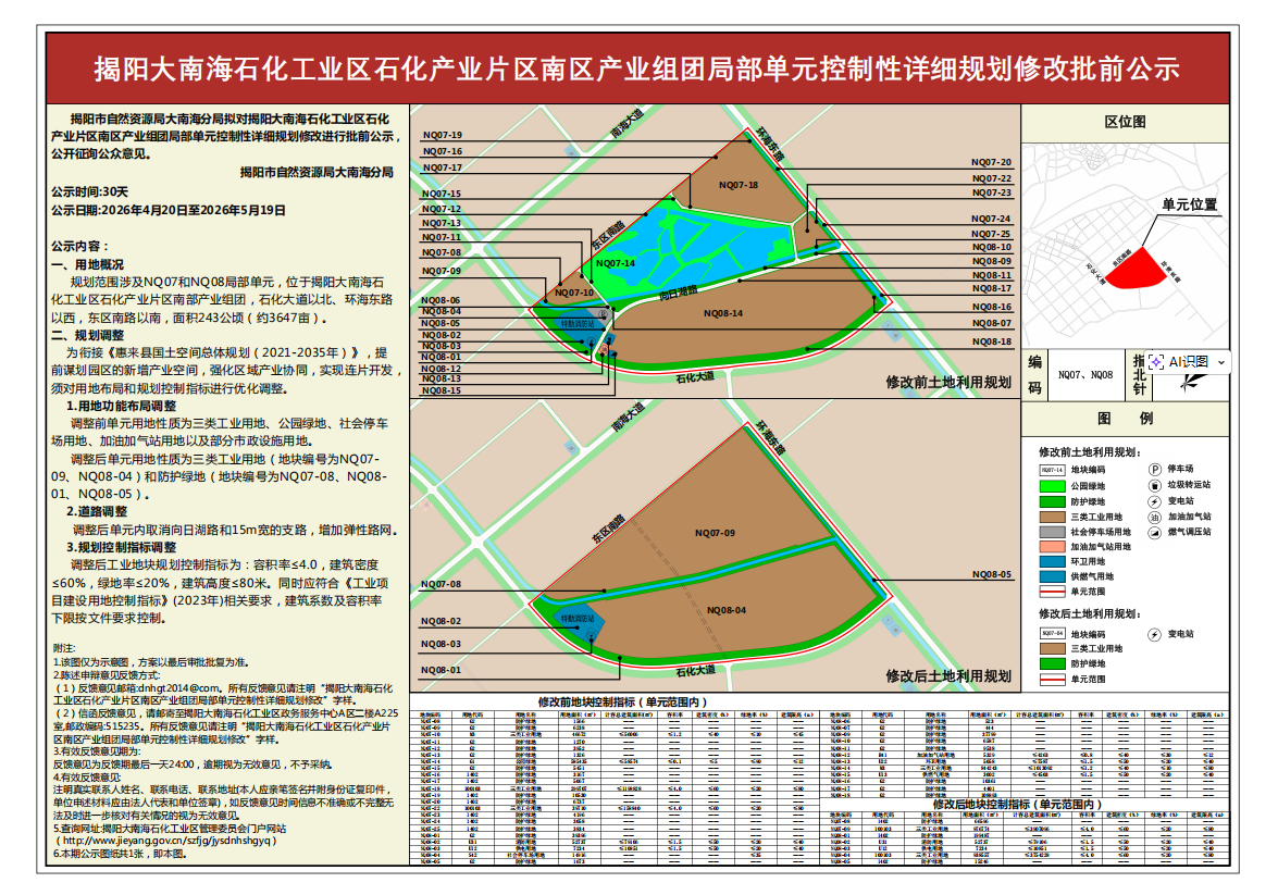 揭阳大南海石化工业区石化产业片区南区产业组团局部单元控制性详细规划修改批前公示