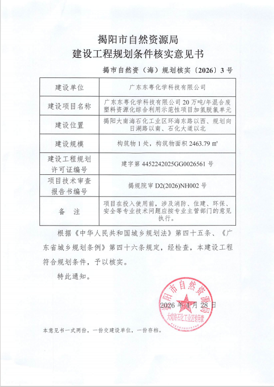 广东东粤化学科技有限公司20万吨/年混合废塑料资源化综合利用示范性项目加氢脱氯单元建设工程规划条件核实意见书