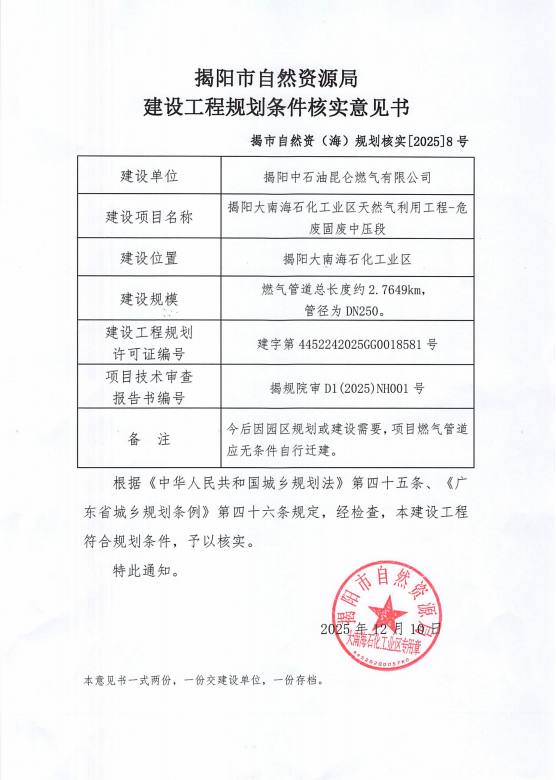 揭阳大南海石化工业区天然气利用工程—危废固废中压段建设工程规划条件核实意见书