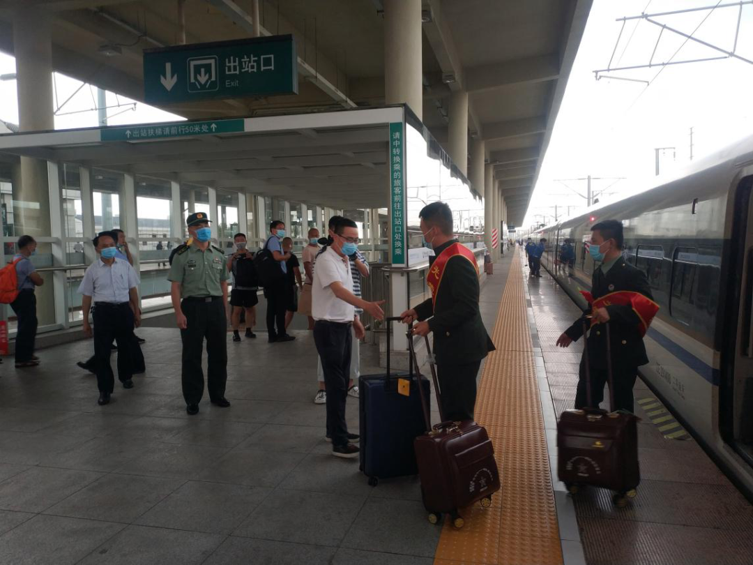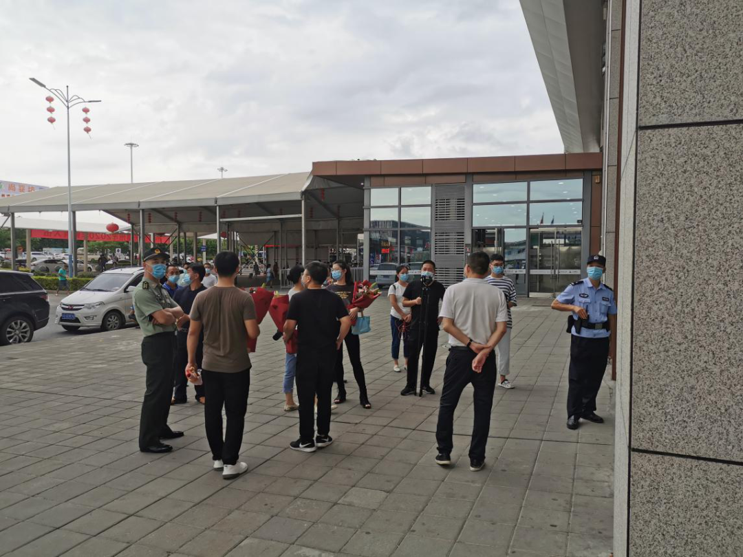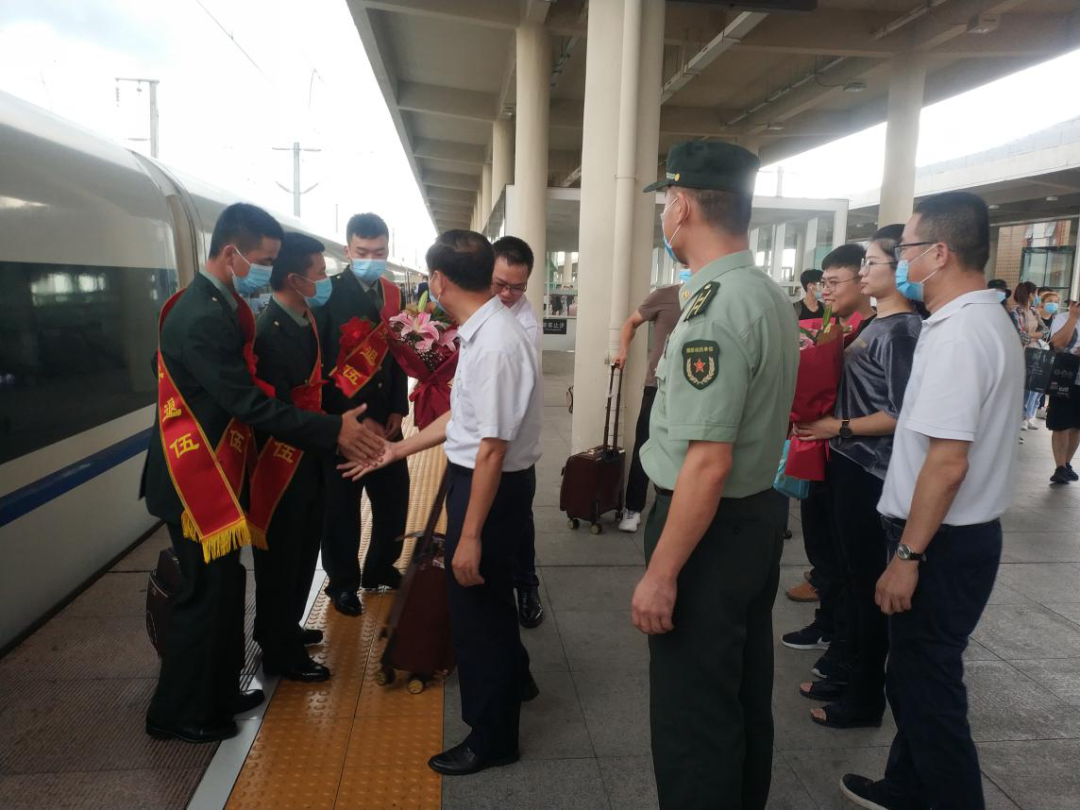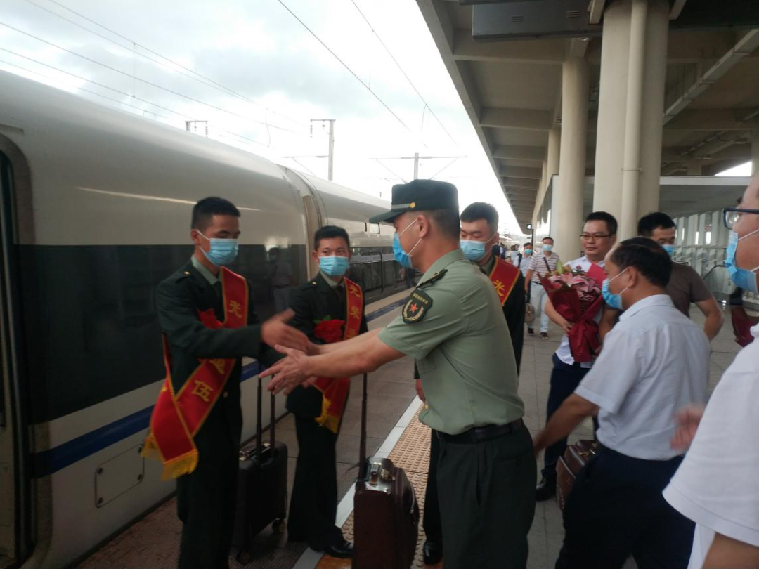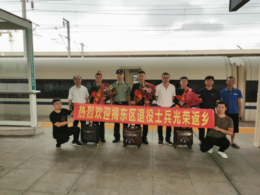 9月9日下午4时,揭东区退役军人事务局江泽华同志牵头区人武部、揭东区退役军人服务中心有关负责同志等一行10多人,到达高铁潮汕站迎接3名从西藏服役退伍的士兵。第一时间为保家卫国做出贡献的退役士兵表示热烈欢迎,为他们献上鲜花、佩戴大红花及绥带,让他们感受到党和政府对他们的关心和关爱,在全社会弘扬拥军优抚的浓烈氛围。