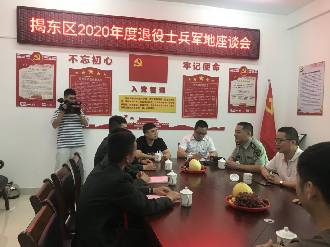 最后,在揭东区退役军人事务局会议室举行座谈会。退役军人事务局主要负责同志鼓励他们把部队的好传统、好思想、好作风带回家乡,做新时代文明的传播者,发家致富、繁荣社会经济的带头人。